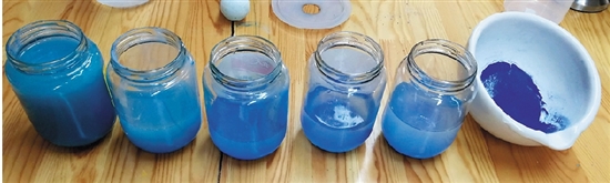 图4 青金石研磨后颗粒粗细变化产生色彩的不同