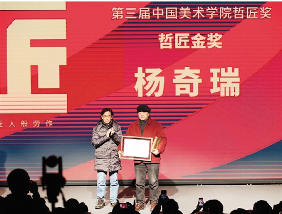 中国美术学院教授、版画家韩黎坤为第三届“哲匠奖”金奖获得者杨奇瑞颁奖