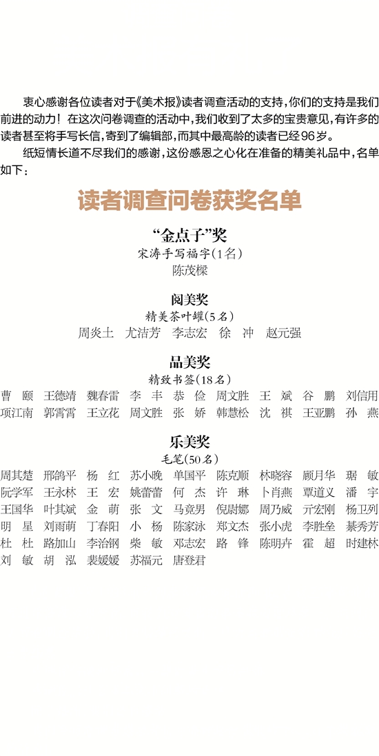 衷心感谢各位读者对于《美术报》读者调查活动的支持,你们的支持是我们前进的动力!在这次问卷调查的活动中,我们收到了太多的宝贵意见,有许多的读者甚至将手写长信,寄到了编辑部,而其中最高龄的读者已经96岁。