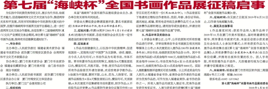 1.作品展览时间:获奖作品和入展作品将于2019年11月在厦门市美术馆展出,届时将邀请相关领导、两岸著名书画家代表、本届活动部分获奖者及社会知名人士参加开幕式;2.所有获奖作品与入展作品将结集出版《第七届“海峡杯”全国书画展作品集》;3.所有参赛作品(含获奖和入展作品)由主办单位收藏,并拥有出版和处置的权力。因人手有限,所有投稿作品不退件。凡投稿者均视为已确认并遵守征稿通知之规定。