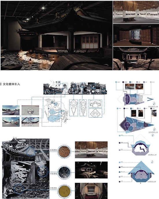 | ●作者:石宇琳、陈静悦(宁波大学潘天寿艺术学院) ●作品名:迹语·蠡社迹忆——社戏文化中心建筑景观、室内设计 ●设计说明:中华文明上下五千年,传统文化源远流长,戏曲文化更是其中一颗璀璨的明珠。而诞生于浙东水乡绍兴的社戏,是这其中独具特色的一颗。社戏的产生与绍兴水网纵横的自然环境密不可分,出现了独特的水上戏曲表演形式,并且兴旺于南宋,到了清末仍旧流行。但是在近现代化的历程中,社戏正逐步尘封于历史之中。我们希望通过一个社戏文化中心的设计使这一文化形式得以保留和延续。既能唤醒老一辈人脑海中关于社戏的回忆,也能让新生代感受传统文化的魅力。 |