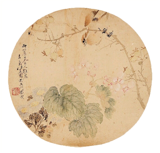 任薰 海棠幽鸟图 26×26cm