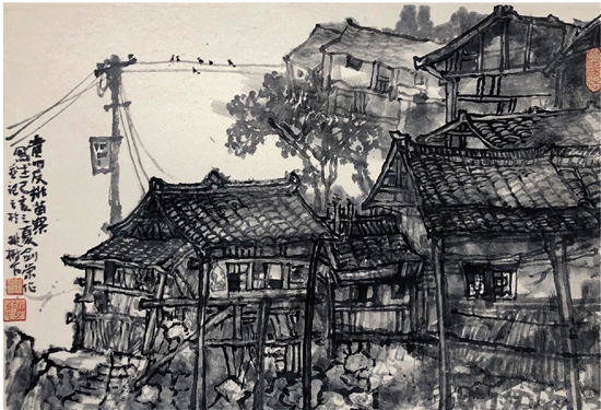 朱剑荣 反排苗寨写生之十 53×36cm 国画 2019年