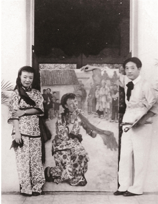 徐悲鸿在《放下你的鞭子》前与王莹合影
