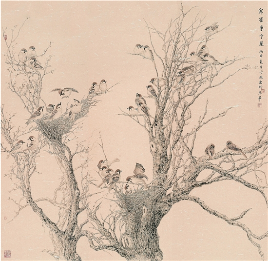 丁鼎 寒雀争空巢(通景) 180×180cm 纸本水墨 2016年(此幅作品入选第十一届中国艺术节优秀美术作品)