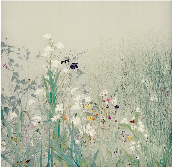 | 李恩成(山东) 芳华 180×180cm 绢本设色 2019年 第十三届全国美展中国画展区获奖提名作品 这是今年入秋以来的第一场小雨,微有凉意,看着雨珠贴着画室的玻璃缓缓下滑,思绪也慢慢回到儿时的家乡。上世纪80年代初北方的平原村庄,柳荫墙根、田间地头和阡陌纵横的稻田荷塘就是我们玩耍和成长的天地,整日与小伙伴们厮混在村子的各个角落,闲花野草都是我们的朋友,蛐蛐蚂蚱、知了青蛙都是我们捉弄的对象。物质匮乏的年代,精神却装满大脑,理想充斥在内心,童年的时光过得悠长而开心。随着年龄的增长,开始走出村庄,天南海北地去看外面世界的精彩,从天真年少走过而立,走过不惑,前进的路上不乏荆棘,有偶尔的成功,也是岁月与沧桑的印记。如今的家乡已被城市的发展淹没,再也找不见那时的一砖一瓦,但记忆中的故乡依然物阜民丰,儿时的歌谣“金滩头,银坝子,吃不穷的冷水沟”依然在耳边回响。《芳华》表现的就是对儿时芳草地的依恋,细嗅花香、静听虫鸣,微风拂过,思接千载,徐熙的野逸,孙廷振的生动,恽南田的清雅,任伯年的率性,都是我学习的源泉,笔墨当随时代,我以我法画我心,既是对大自然的崇敬,也是对祖国日新月异发展屹立在世界强国之林的致敬,“苔花如米小,也学牡丹开”,仅以此作献给新中国成立以来为祖国的发展做出贡献的,奋斗在各行各业默默无闻无私奉献的广大劳动者,也祝愿我们的祖国繁荣昌盛,一路芳华。 |