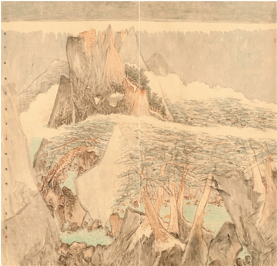 | 邱佳铭(北京) 八君子图 200×190cm 2019年 第十三届全国美展中国画展区获奖提名作品 长松亭亭为众木之表,其势如君子轩然之态。松树的坚韧、不凋、坚贞凌霜,或抱节自屈,或挺拔堂正,高洁如君子之德。中国历史上不乏礼赞松树的文学、绘画作品,松树作为君子比德的重要载体之一,已然沉淀为中华民族的文化符号。在新时代的中国,君子之德依然值得继承和发扬,立足当下,坚持文化自信,并对这一优秀文化符号注入体现时代精神、时代脉搏的新内涵。《八君子图》就是在这样的认知下创作而成的,画面以挺拔的松树为主体,简洁稳固的三角形山体为背景,辅以白云绿水,营造出君子之德蔚然成风的画外之意。 |