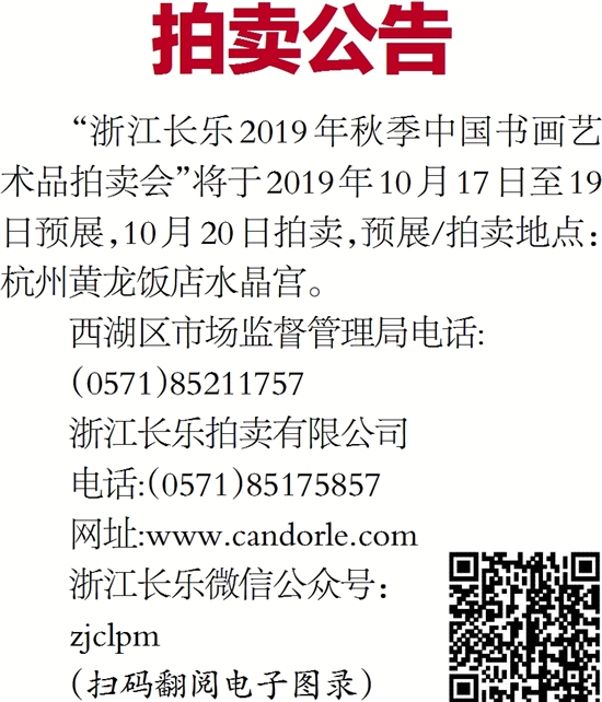 “浙江长乐2019年秋季中国书画艺术品拍卖会”将于2019年10月17日至19日预展,10月20日拍卖,预展/拍卖地点:杭州黄龙饭店水晶宫。