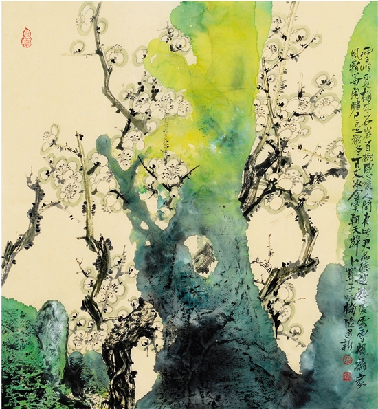 张建新 春之俏 48×44cm 在仿古纸上泼洒几块意象形体,穿插几枝梅花,别有一番意蕴。