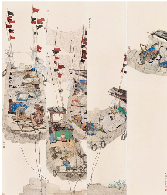 莫淑莹(广东) 小小鱼排岸边连 200×43cm×4(组合) 收藏作品
