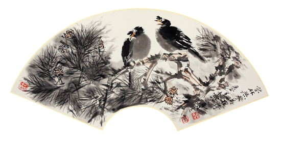 雷家民 空林无人鸟相呼 30×60cm 扇面