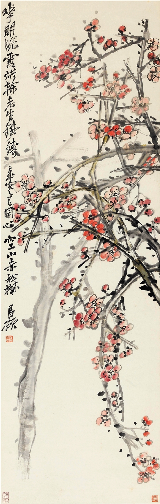 ◀吴昌硕 红梅 137×43.5cm 中国画 纸本水墨设色 年代不详
