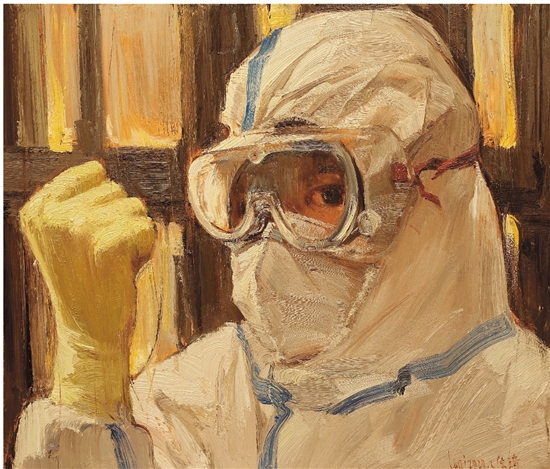 我所创作的油画作品《天使弘毅》,反映的是抗击新冠肺炎第一线的白衣天使。画中描绘一名前线穿着一层厚厚的防护服、戴着口罩和护目镜的医务人员。但正如一首歌里所唱到的:“我看不见你温柔的面孔,却看得见你美丽的眼睛。” 画中虽然看不清完美的五官,护目镜上还起着一层水雾,但从护目镜后望过来的眼神,使人感受到一种了不起的责任和担当。在创作中我还特意使用了干脆利落的笔法,着力表现力度感,以及他们的坚强和信念。
