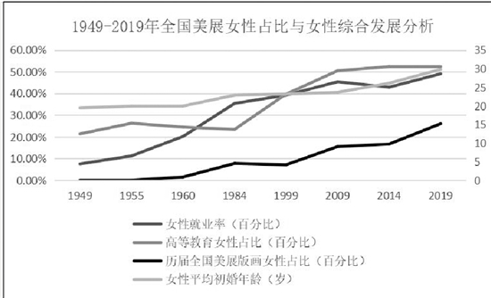 1949-2019年全国美展女性入选占比与女性综合发展因素分析图