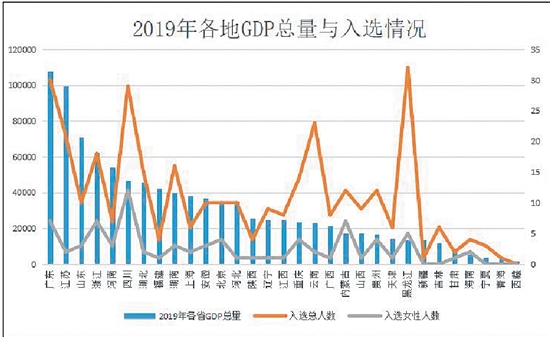 2019年地区经济与各地入选艺术家,女性艺术家分布图