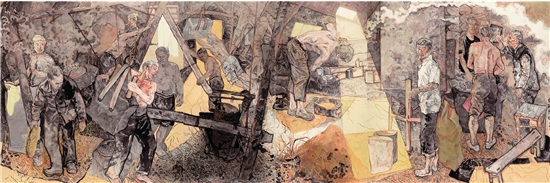 导师点评:在古铜色的昏黄秘境中,去践履一种明快光色的切割构成,与这块古老土地上史诗般劳作的深度混响。这是有难度的,首先要以谨细的部件去拼装一定规模的建构,难点在于斑斑迹迹须无损通幅气象;其次,人物形象及身段的细节传达须结实而松快,且无伤火热场景的生气流贯;再就是数年习得的毛笔思维如何在新手法新图式的挤兌中,胜出为统帅。综言之,鉴赏一幅好画大画,无异于对画者的多方考察,王鹏以其有限的年岁和阅历,既获得了可观的综合力,是值得特别关注的。 ——尉晓榕