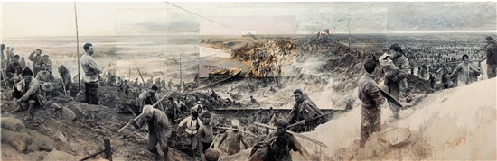 创作说明:《大围涂》以宏大的视角,表现了杭州湾上个世纪60年代开始的横跨半个世纪的围海造田历史,画面以围涂历史照片为中心,通过合理想象与艺术夸张, 向边缘延伸出两个不同的场景。形成一个冬天—夏天—冬天的画面轮回。这是一个可以无限延伸的画面结构, 这是一种“围”的画面形式,这就是开拓进取的围涂精神。