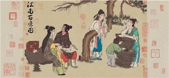 《吴门画苑图》描绘了在“江南百景图”的游戏世界中,文徵明、仇英、唐伯虎、沈周四位画家齐聚树下,构思创作的场景。