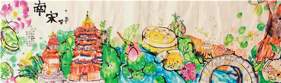 孙乐语(8岁) 梦南宋 教师点评:用色艳丽,线条流畅,很有杭城风貌特色。