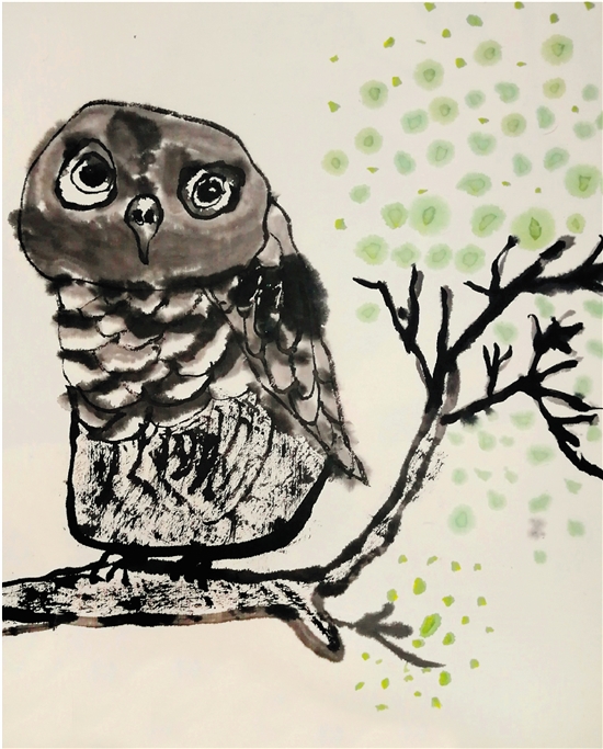 教师点评:猫头鹰紧凑的笔墨刻画,警惕的神态、表情与空灵散漫的树叶相映成趣。