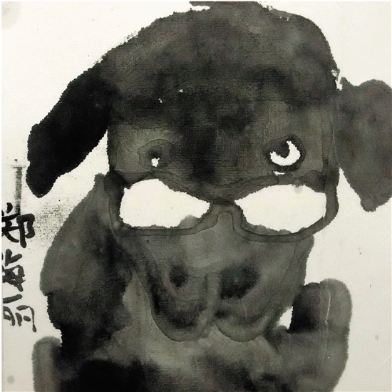 郑海丽(10岁) 近视的小狗 教师点评:可以看出作者画画时的自信,小狗的眼睛和眼镜留白,突出了小狗的憨态。