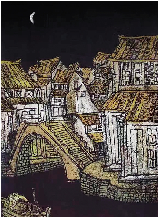 陈子骁(乐清市职业中等专业学校) 江南韵 版画 点评:作者采用吹塑版画的手法,描绘一个古朴宁静的江南水乡,勾起游子心中难舍的乡愁,又是一首赞歌,讴歌新时代的美好生活。