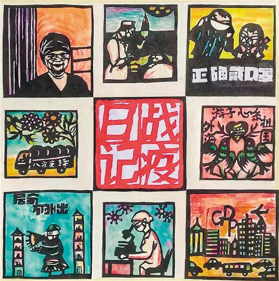 翁若惜(乐清市职业中等专业学校) 抗疫日记 刻纸 点评:作者活用九宫格的方法,呈现高中生眼中庚子年疫情的每个瞬间,沿用乐清细纹刻纸相关技法,为抗疫阻击战呐喊助威。