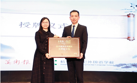 美术报总编辑杨丽向杭州新世纪外国语学校校长虞大明授牌