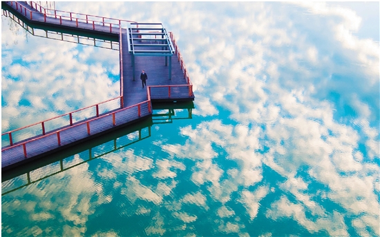 金狮湖上的栈道和蓝天白云的倒影