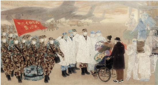 郭海荣 范向辉 于理 王亚非 李玉旺 为了人民 工笔重彩 2.5×4.5米 2020年