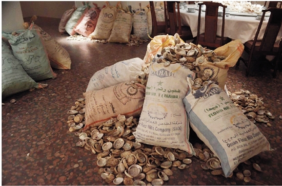 郑马勒(组合) 贝壳里的一季 双频影像装置,鲍鱼壳,瓷器餐具,桌椅,文本