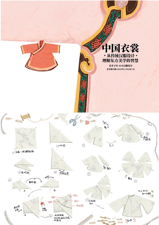 “青青子衿·小汉服设计”,课程设计依托中国礼仪文化底蕴,以汉服文化传承为脉络,以创新实践活动为载体,向孩子们展示华夏衣冠复兴历程,重点介绍了汉服的概念及其基本特征,以及汉服的穿着、礼仪、发展史、款式、纹饰图案、配色等。在老师们的指导下,孩子们和家长共同协作,通过折纸、了解纹样、测量、裁剪等步骤,完成了量身定做的小汉服。