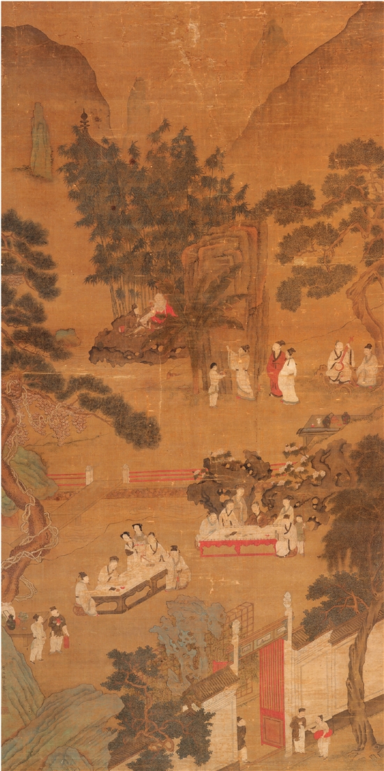 | 明 仇英 西园雅集图(传) 141×66.3cm 绢本 立轴 设色 台北故宫博物院藏 北宋元祐年间,宋神宗朝附马都尉王诜邀请了以苏轼为代表的当时16 位文人雅士以及他们的侍从来自己家中聚会,聚会活动的主要内容则是作画、学禅、论艺、咏诗、品鉴书画。这16 位文人雅士分别是:苏轼、王诜、苏辙、蔡天启、李瑞叔、黄庭坚、米元章、秦观、陈碧虚、张来、郑靖老、晃补之、刘巨济、王仲至、圆通大师、李公麟。作品由李公麟完成,取名《西园雅集图》。此幅画雅集情景,托名仇英,细观之、虽未必仇实甫手笔,尤是明代仿宋画之伪好旧物。从中可一窥宋代文人的日常。 |