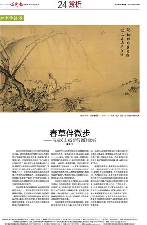 美国哲学家乔治·桑塔耶纳在《美感》书中认为:“事物之所以引人兴趣,因为我们关心它们;事物之所以显得重要,因为我们需要它们。艺术魅力之大小,视乎它是否有能力召唤我们离开平凡生活的纷扰而达到更自由更美满的活动之乐趣。”马远《山径春行图》中的情景,虽然指事并无惊人之处,抒情也似乎一般,但是,细细品味之下可窥见作品深意,一是人物与山水的自然融合,是情与景的合唱;二是如果说《踏歌图》中人物以动感活跃了画面,《山径春行图》则让人物在平凡生活的状态中,移置于大自然春天美景中,获得更自然、更自由和更美满的乐趣,而使作品获得更大范围的审美共享。