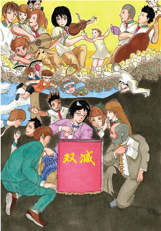 点评:小画家用丰富的卡通造型组合出一个充满活力的空间,用艺术语言告诉我们:生活是丰富多彩的,学习之余我们还要参加多种多样的文体活动,让我们的身心得到全面的发展。(刘一丁)