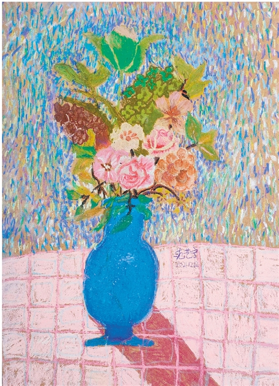 点评:一束插在花瓶鲜艳欲滴的鲜花,一抹阳光的照射的阴影,背景看似无意的浓密而柔和的色彩,恰恰衬托出恬静而美好的生活。一幅静物写生呈现出小作者积极向上,充满阳光的健康心理。(靳长安)