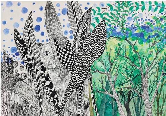 点评:彩色的世界和黑白的世界这样和谐地共处,非常新颖。小动物的眼神就是小画家对这世界的好奇心。(刘一丁)