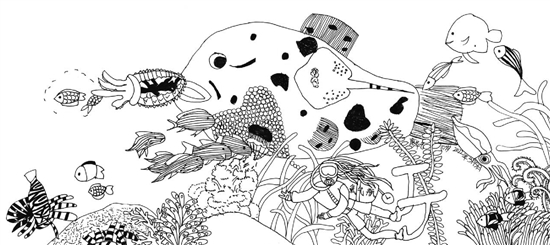 点评:整幅画面以线描的形式创作,点线面自然组合,疏密浓淡关系处理得都很好,我们仿佛身临其境,与潜水员一起在海洋世界与海洋生物和谐共舞。(刘一丁)