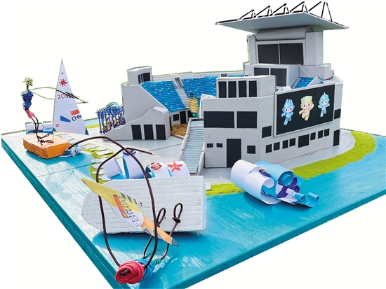 | ▶作品名称:象山沙滩排球馆 学校:宁波北仑区蔚斗小学 作者:谢瑾薏、刘欣怡、王紫璇、纪名扬、胡梦萱 指导老师:顾颖超、沈露艳 创作说明:第19届亚运会将在浙江杭州举行,我们宁波也设立了象山分会场。通过精密计算排球馆比例,我们运用硬纸板做出象山沙滩排球场馆。场馆完成后,我们再利用废旧电线的可塑性拗出沙滩排球运动员和帆船运动员。在运动员动态表现上我们选择了动态幅度较大的瞬间,从而表现出比赛的激烈。 |