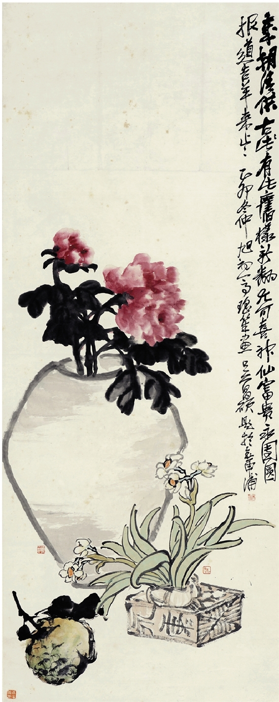 王震 程璋画 吴昌硕题 岁朝清供 135.5×53cm 国画