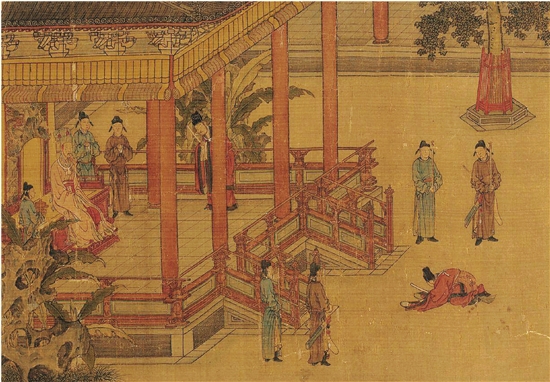 宋高宗书孝经马和之绘图(局部) 穿朝服的官员进谒头戴冲天冠、身穿大礼袍的皇帝