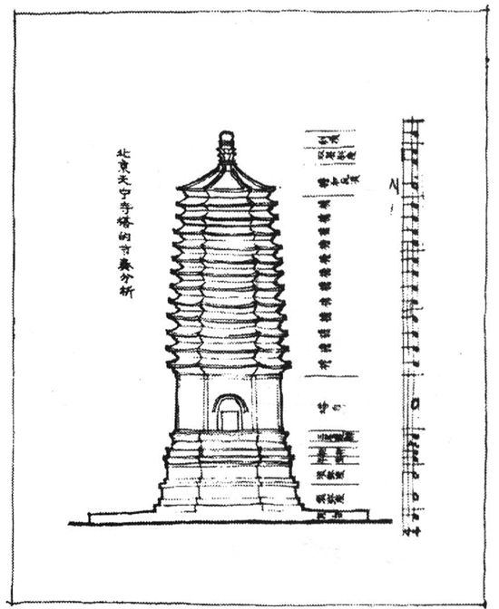 ◀图1梁思成依照对天宁寺塔的纵向分析得出的层次和高低不同的比例,谱写了一段曲子。