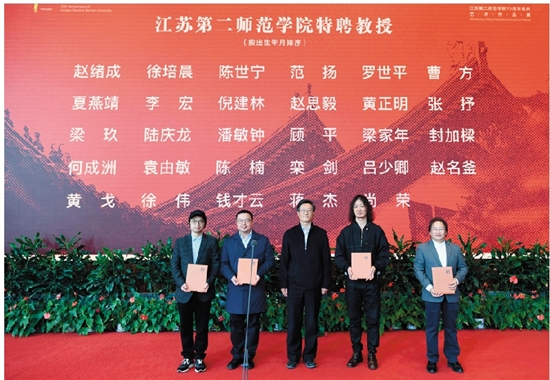 江苏第二师范学院校长王建为特聘教授颁发证书并合影