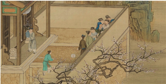 拾阶而上,一个浅色绿衣小童一路小跑,他怀中揣着一把笤帚,仿佛是着急去打扫和清理场地。不远处有一群文人,扶着矮墙,正向远处眺望。他们眺望的是什么呢?画面中并没有描绘,或许是远处的烟花,也或许是天边的满月吧!元宵节总有许多供人观赏的美景、美物,让人目不暇接。一旁的童子,也挑着一盏灯笼,灯笼里的蜡烛燃烧正旺。正朝大门方向走的童子,手捧一瓶花,瓶中插着梅花与松柏,这是“岁寒三友”其中的两种植物。
