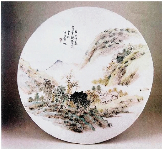 清末 任焕章浅绛彩山水圆型瓷板
