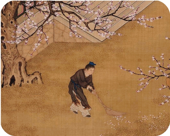 | 画面的前景,一小童正在打扫片片飘落的花瓣。开满枝头的杏花,花朵繁密,被称为“一树万蕊”。杏树,是原产于中国的古老栽培果树,至少有3500年的栽培历史,它与桃、李、枣、栗并称为五果。杏花是蔷薇科李属落叶小乔木,是杏树的花朵。我国自古就有以花草喻美人的传统,杏花自然不能例外。古人用“杏眼”来形容女孩子漂亮的眼睛,仿佛在春风中含笑。 据记载,孔子也很喜欢杏花,他教授学生时坐在杏坛之上。“孔子游乎缁帷之林,休坐乎杏坛之上。弟子读书,孔子弦歌鼓琴”(出自《庄子》)。后世文人看到杏花就会联想起孔子,以及所学的儒家文化。“杏坛”也成为现在中国教育界的代名词。在古代,杏花还常常有“幸运”的含义。杏花开时,正巧是科举考试的殿试之时,因此人们就用“杏花春燕”来比喻“殿试及第”,而杏花也被称为“及第花”。 ▲打扫花瓣 |