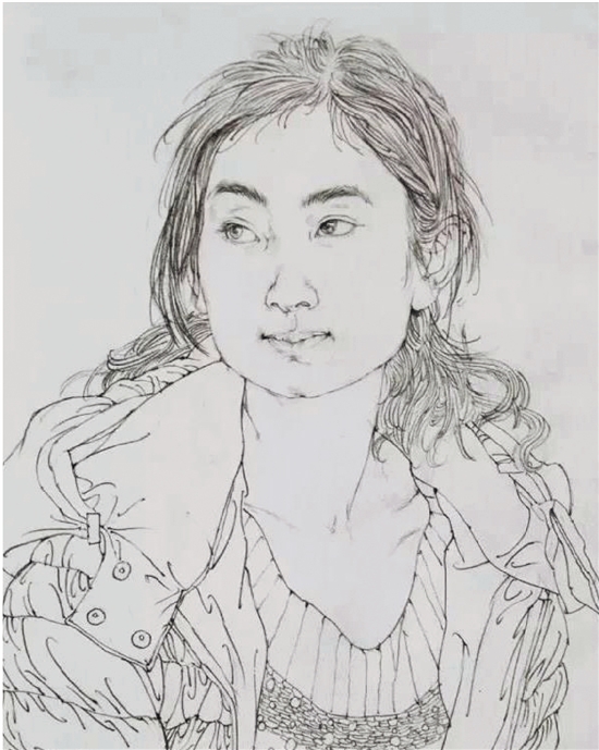 提供一张青年女性头像的线描图片,根据人体结构的规律进行推想,将线描轮廓内的部分补充为具有明暗色调和体积空间的头像素描。