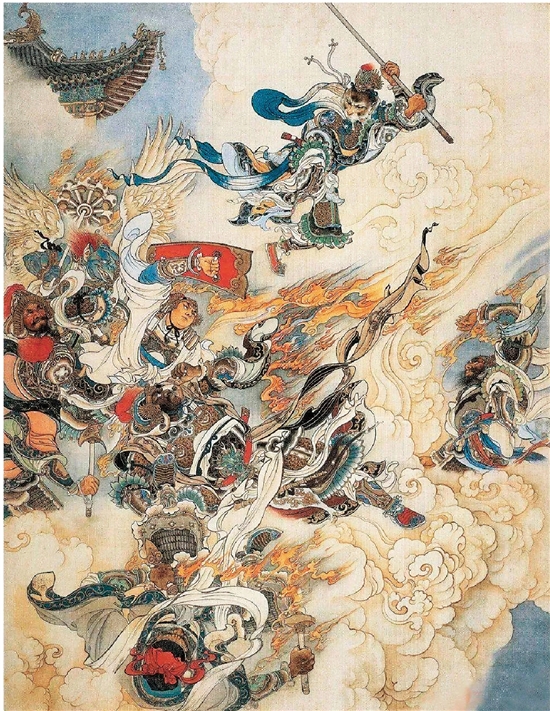 请参考民间剪纸艺术的构图法则、造型规律和风格特点,绘制一幅《孙悟空大闹天宫》。