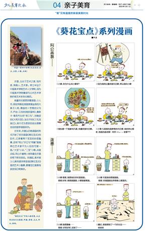 近年来,许嘉以四格漫画的形式开始了系列漫画《葵花宝点》的创作,记录着两个宝宝的妙语趣事,还有“阿公”许江与“阿婆”施慧两位艺术家不为人知的可爱一面。“大宝”小点、“二宝”小葵、点爸点妈、阿公外婆等人物形象在许嘉的笔下鲜活灵动。本期起,美术报少儿美育读本将连载《葵花宝点》里的艺术小趣事,跟着这位温柔母亲发现日常美好。