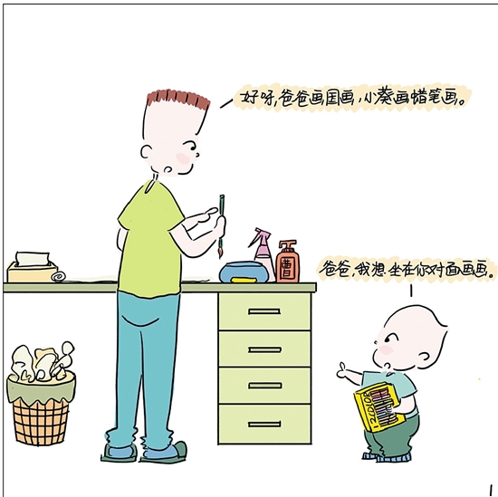 爸爸:好呀,爸爸画国画,小葵画蜡笔画。